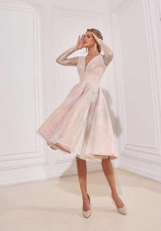 Cocktailkleid mit V-Ausschnitt, Mesh-Ärmeln und Midi-Saum