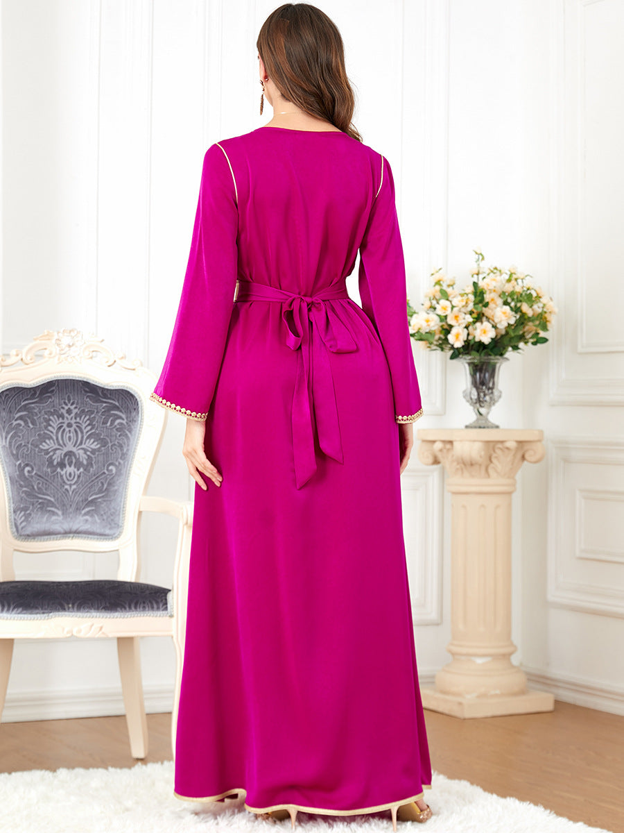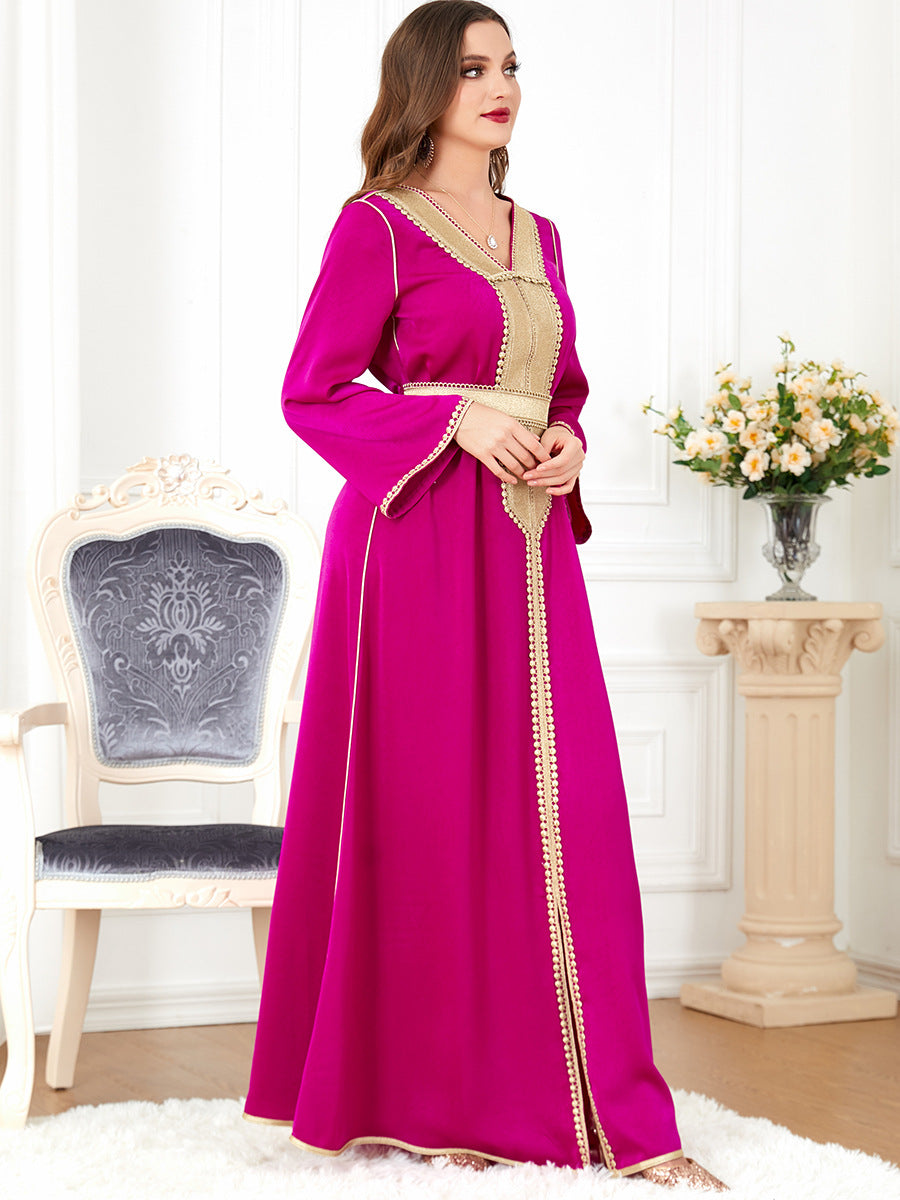 Stand out in the crowd wearing the Women's Long Sleeve Velvety Maxi Gown featuring gold trim along the bodice and the edge of the sleeves.