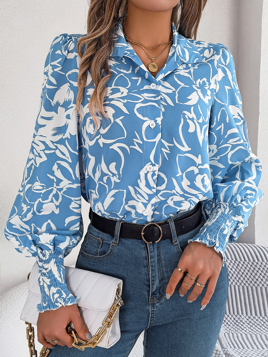 Women's Elegant Color-Blocked Floral Lantern Sleeve Lapel Shirt