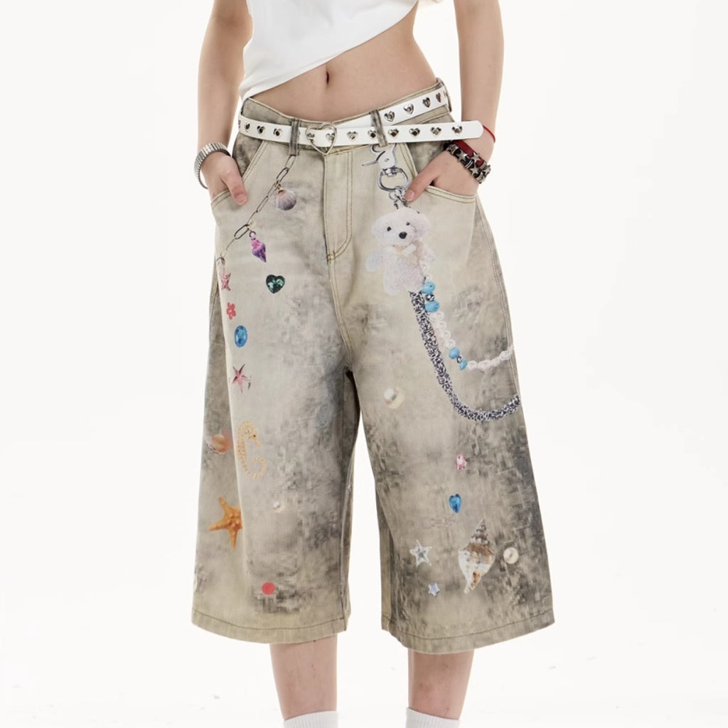 印刷されたアートが繁栄した、創造的なクロップドワイドレッグジーンズ