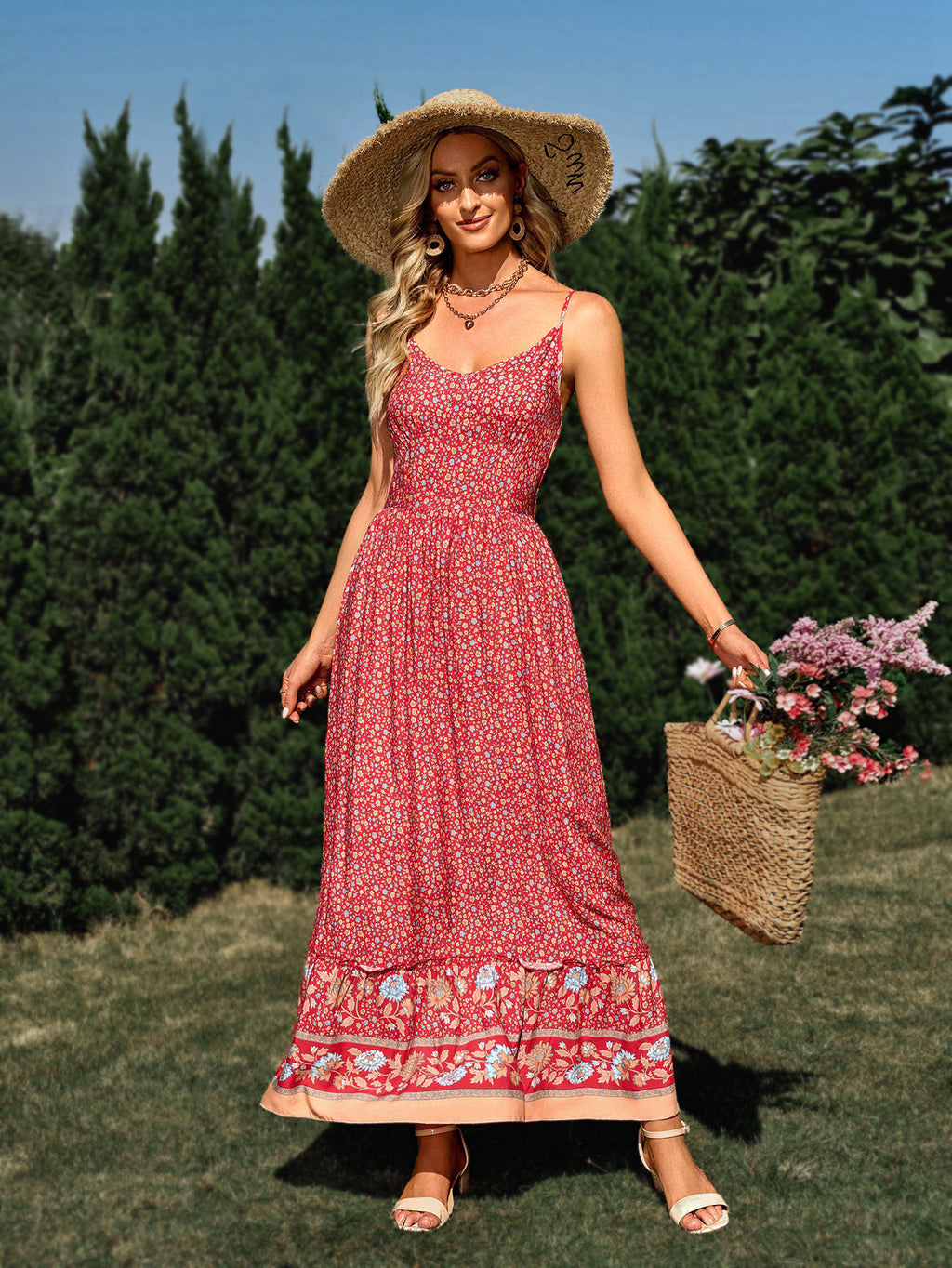 女性のスパゲッティストラップパターンのマキシドレスを着て、カジュアルな外出で最高の外出を見てください。このドレスには3色のいずれかがあり、裾に沿ってペイズリーにインスパイアされたディテールが特徴です。