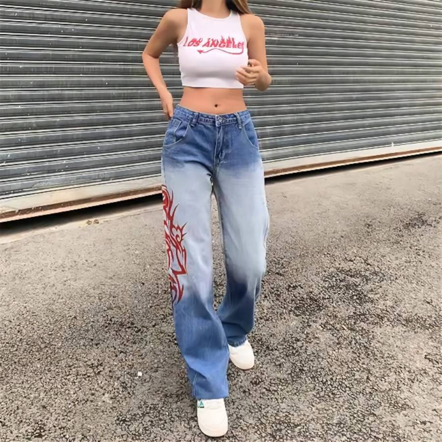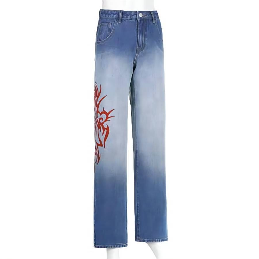 Stand out on the streets in the Women’s High Waist Denim Jeans with Red Patterning. An intricate red graphic is found on the side of one thigh to decorate the acid-washed denim.