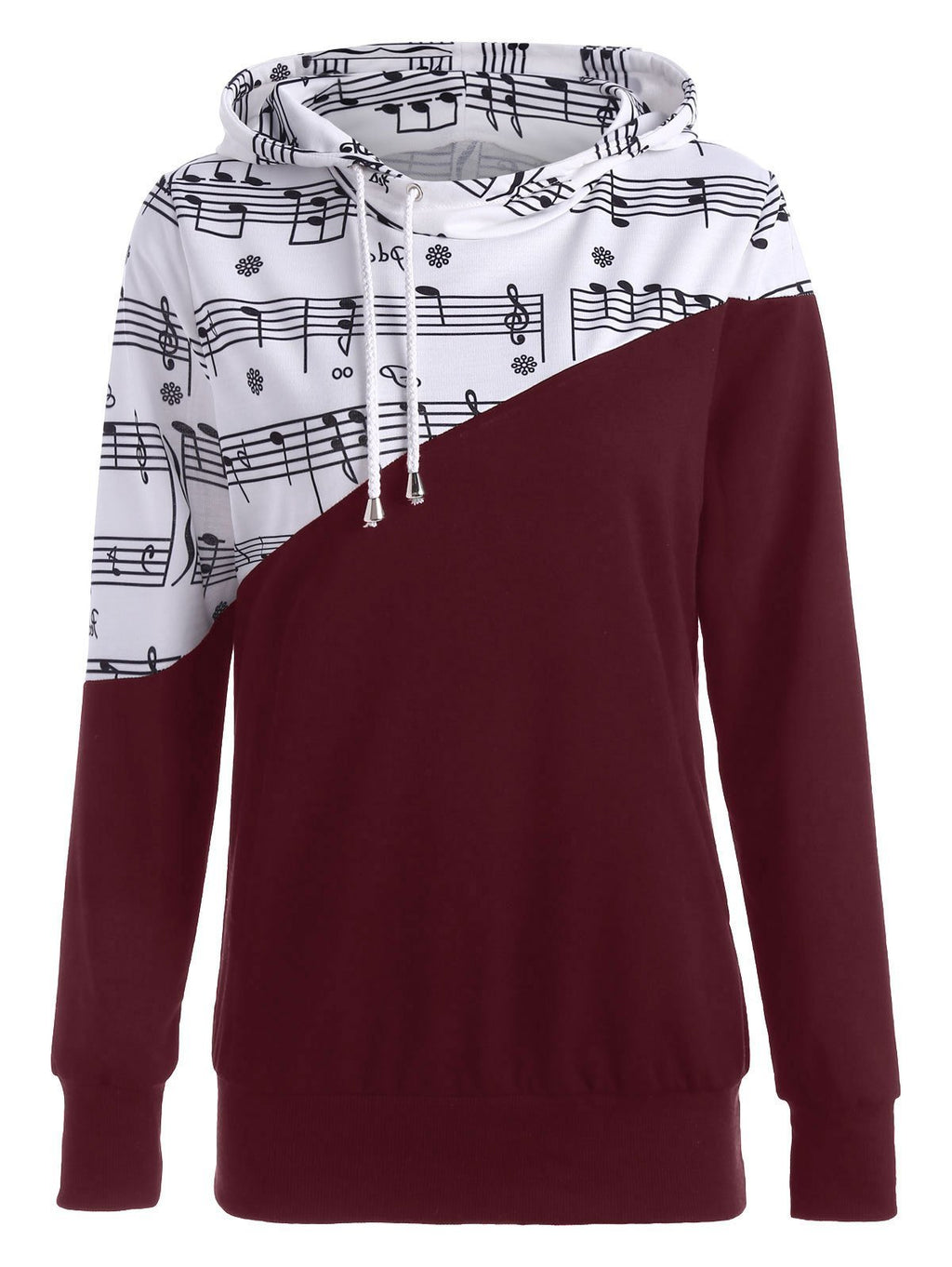 Express your love of music in this Half Time Music Note Sweater featuring an asymmetrical design with a music note pattern on the top and a solid color of your choice on the bottom.