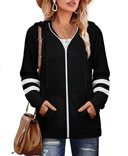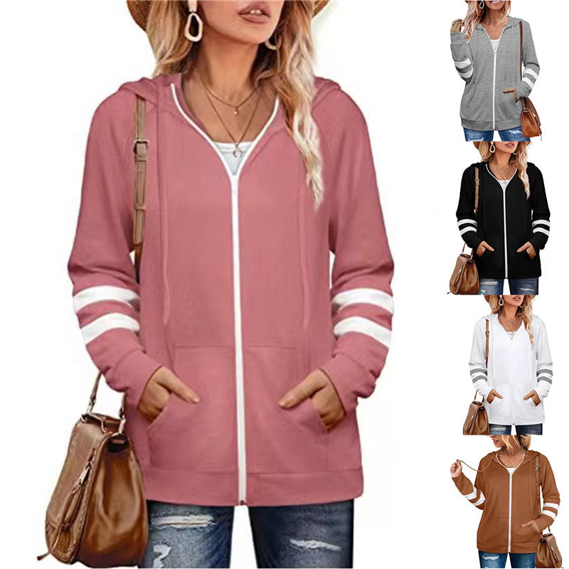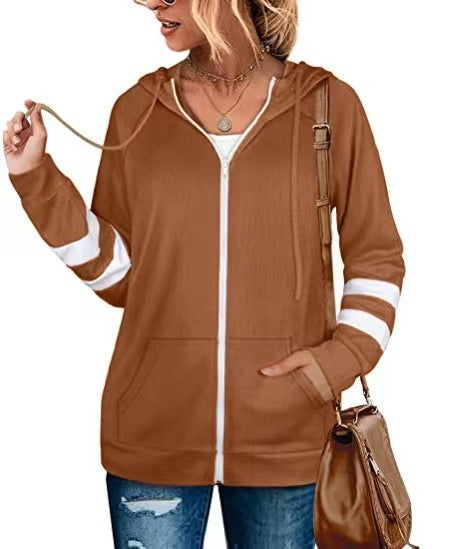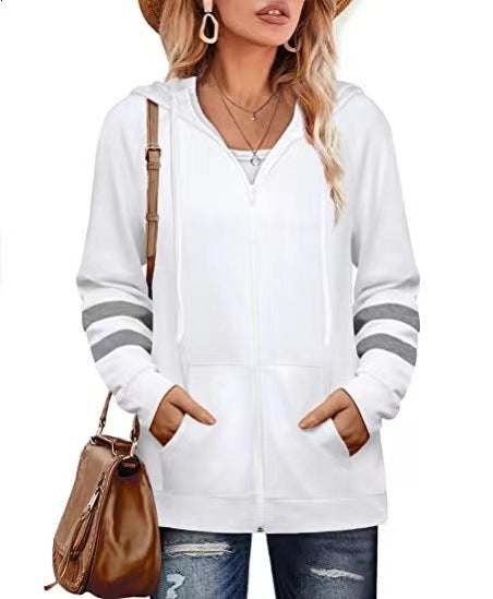 Lightweight Hoodie with Zippered Closure and Striped Sleeves