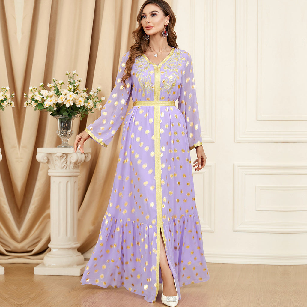 Sparkle and shine in any room you enter wearing the Women's Pastel Green and Gold Shimmery Polka Dot Maxi Dress featuring a small slit in the front.