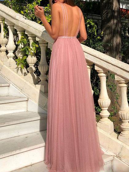 Vestido rosa de estilo de princesa com decote em V e maxi hem